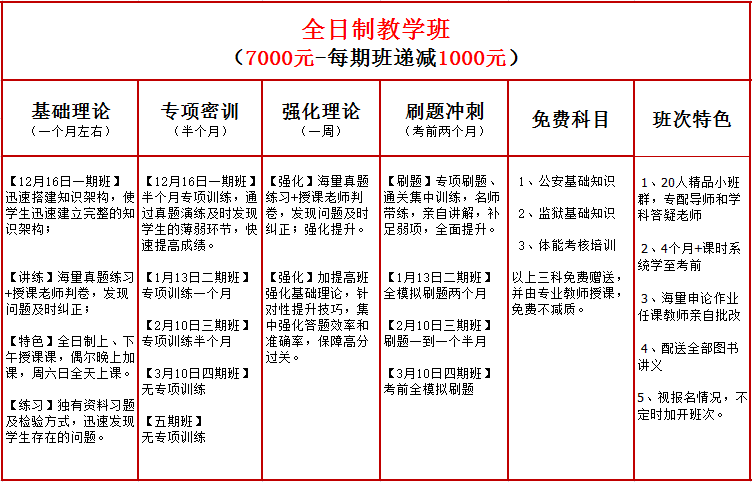 全年班(整年學(xué)習(xí)),學(xué)習(xí)3次課。所有教案,卷子,題庫都免費發(fā)放。大概1000元的資料大放送,公安基礎(chǔ)監(jiān)獄基礎(chǔ)免費!